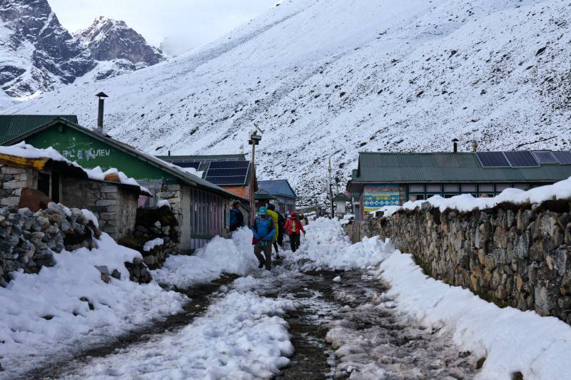 Locals were busy shoveling snow and clearing doorways, preparing for the return of trekkers. Hopefully, Pheriche will soon be bustling again with hikers sharing stories and laughter.