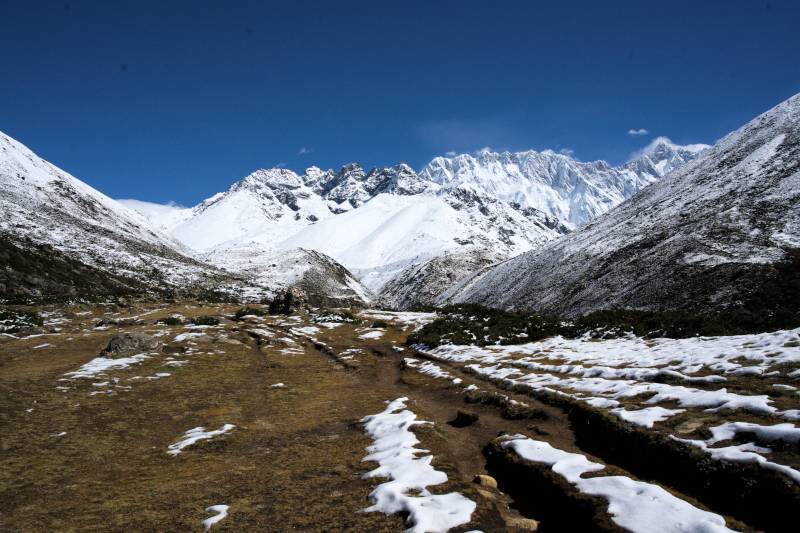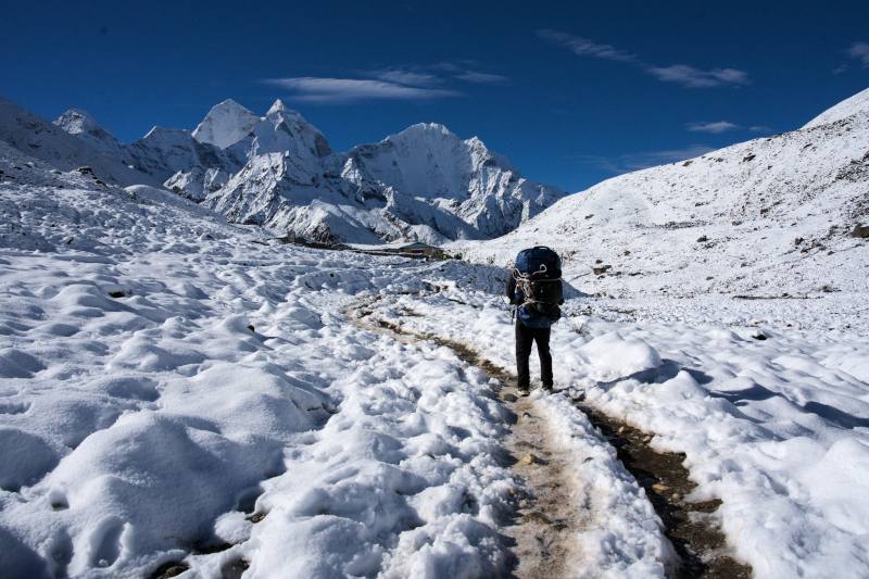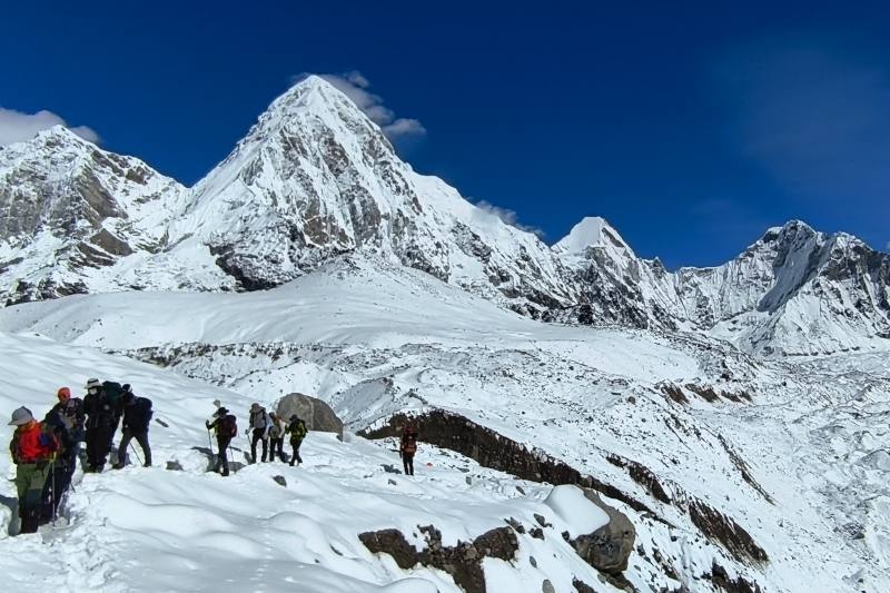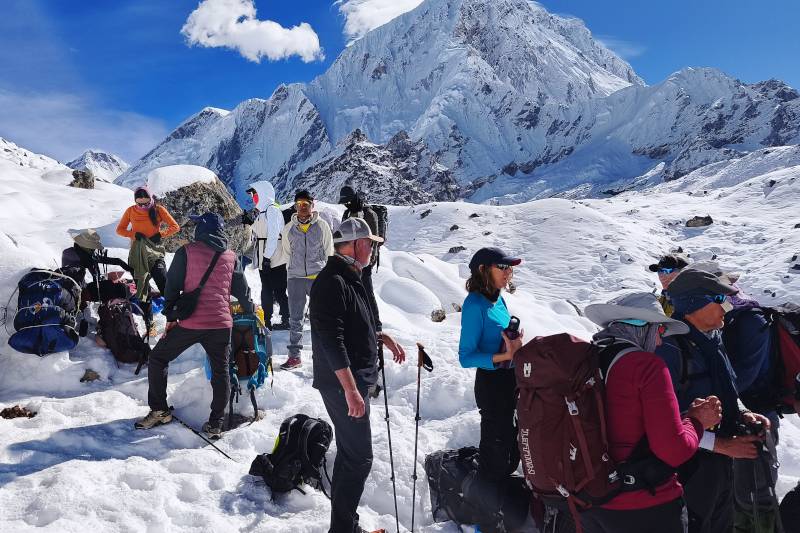 The wet, unstable surface and hidden ice holes made every step a struggle. They stopped for lunch at Thukla (4,620 m) before tackling the steep ascent to Thukla Pass, also known as the Everest Memorial, a deeply moving place dedicated to climbers and Sherpas who lost their lives on Everest and throughout the Khumbu region.