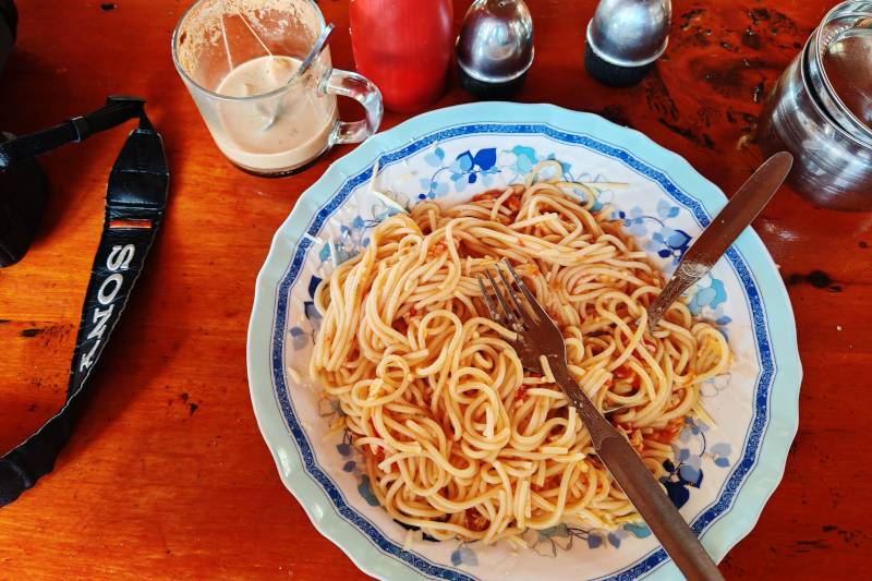 By lunchtime, my appetite returned, and I happily tucked into fried noodles and a cup of masala tea. The weather turned out beautifully with clear skies and sunshine all day, so most trekkers took the opportunity to dry their soaked shoes, pants, and socks in the sun.