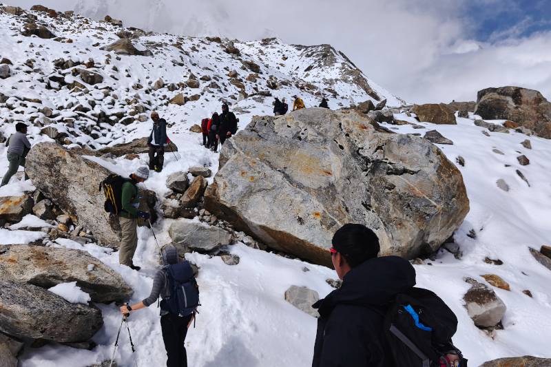 This section was crowded with fellow trekkers all sharing the same dream. Though the path wasn’t steep, the thin air made every step exhausting. Huge boulders, which were partially buried in snow, added to the challenge. The ice was so slippery that they slipped and fell several times, despite wearing crampons.