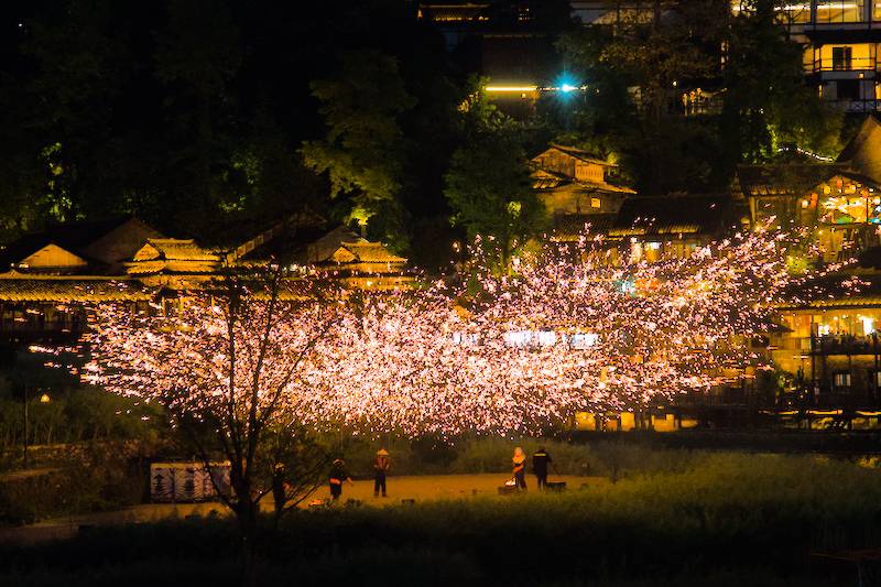 As night fell, the drone show commenced, accompanied by vibrant Da Tie Hua (打铁花) molten iron performances along the river. The lights shimmering on the water and the reflections all around created a beautiful, almost dreamlike atmosphere.
